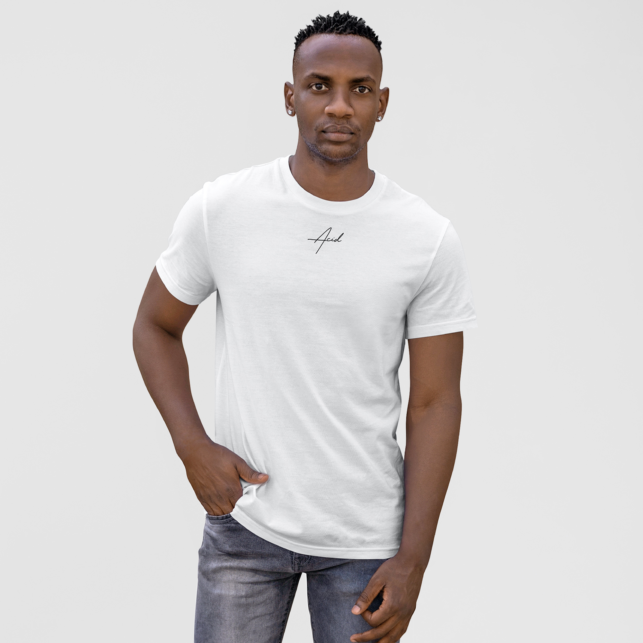 Acid Signature Eco T-Shirt. All colourways are made from in conversion organic cotton. Combed cotton. Tubular cut. Straight fit. Round ribbed neckline with double topstitching. Matching taped neck. Twin needle finish at cuffs and hem.